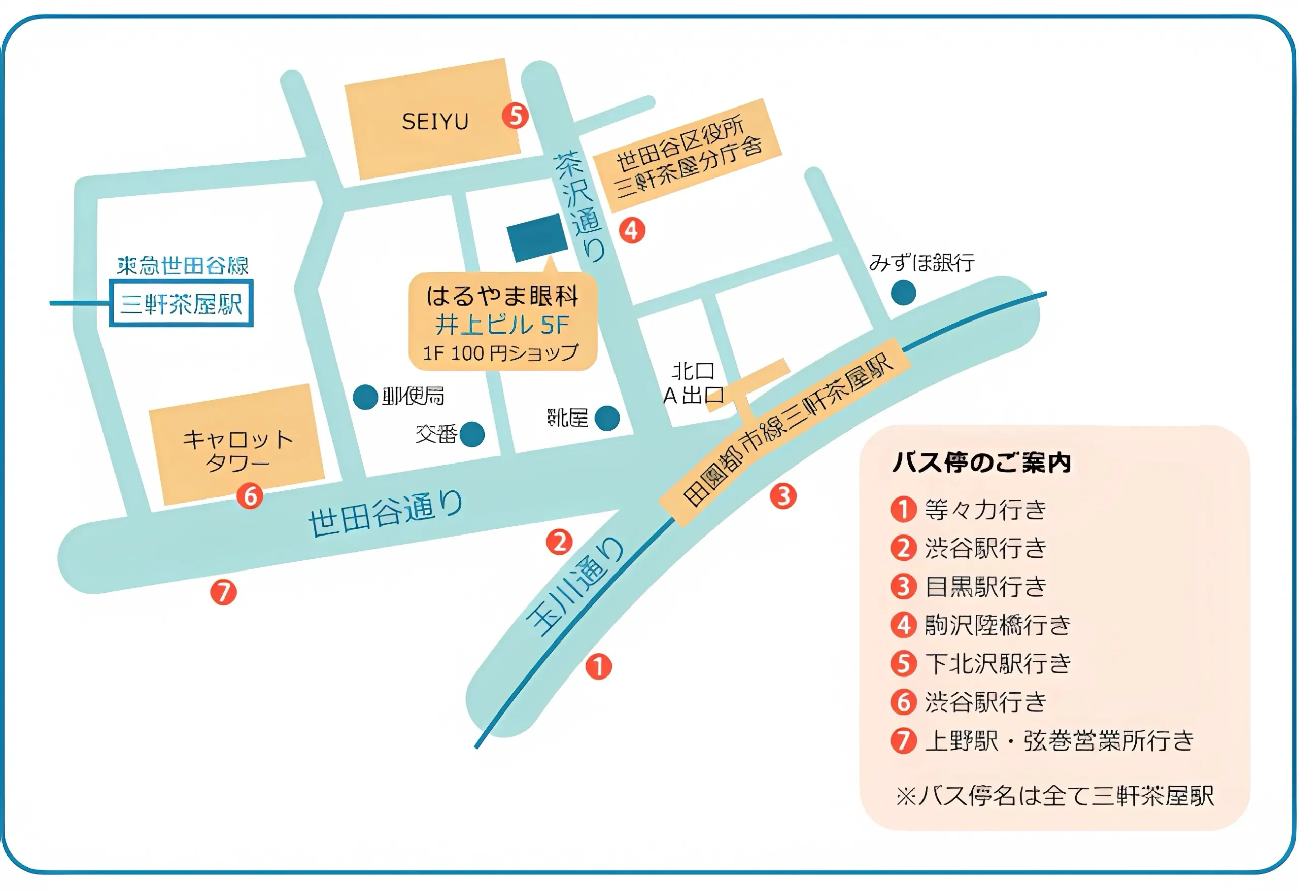 はるやま眼科は三軒茶屋駅から大変近くアクセスが良いため、世田谷線沿線の西太子堂、若林、松蔭神社前、世田谷、田園都市線沿線の渋谷、池尻大橋、駒沢大学、桜新町、用賀、二子玉川などからも通院頂けます。